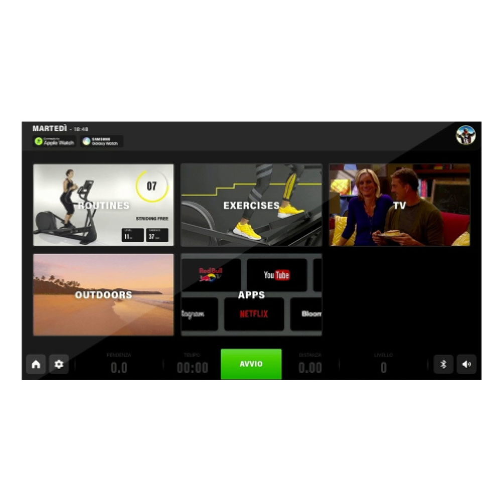 Mit UNITY können Sie Outdoor-Kurse in simulierter Realität auswählen oder sich über Skype mit Ihren Freunden oder Ihrem Trainer verbinden. Wenn Sie ein Foto Ihres Trainings mit ihnen teilen möchten, ist dies möglich.